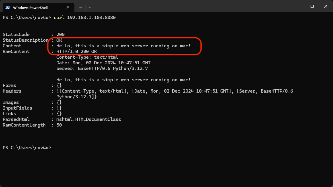 After setting up the server, we can access it using a web browser or the curl command: