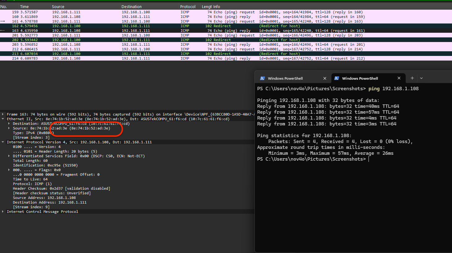 We can observe that the ICMP request initiated by the victim reaches the attacker. The attacker then forwards this request to the Mac server, allowing the server to send a reply back to the victim. The victim receives the correct ICMP reply with the IP address 192.168.1.108 and the MAC address 8e:74:1b:52:ad:3e. Although each request’s MAC address is that of the attacker, the victim ultimately receives the proper ICMP reply.