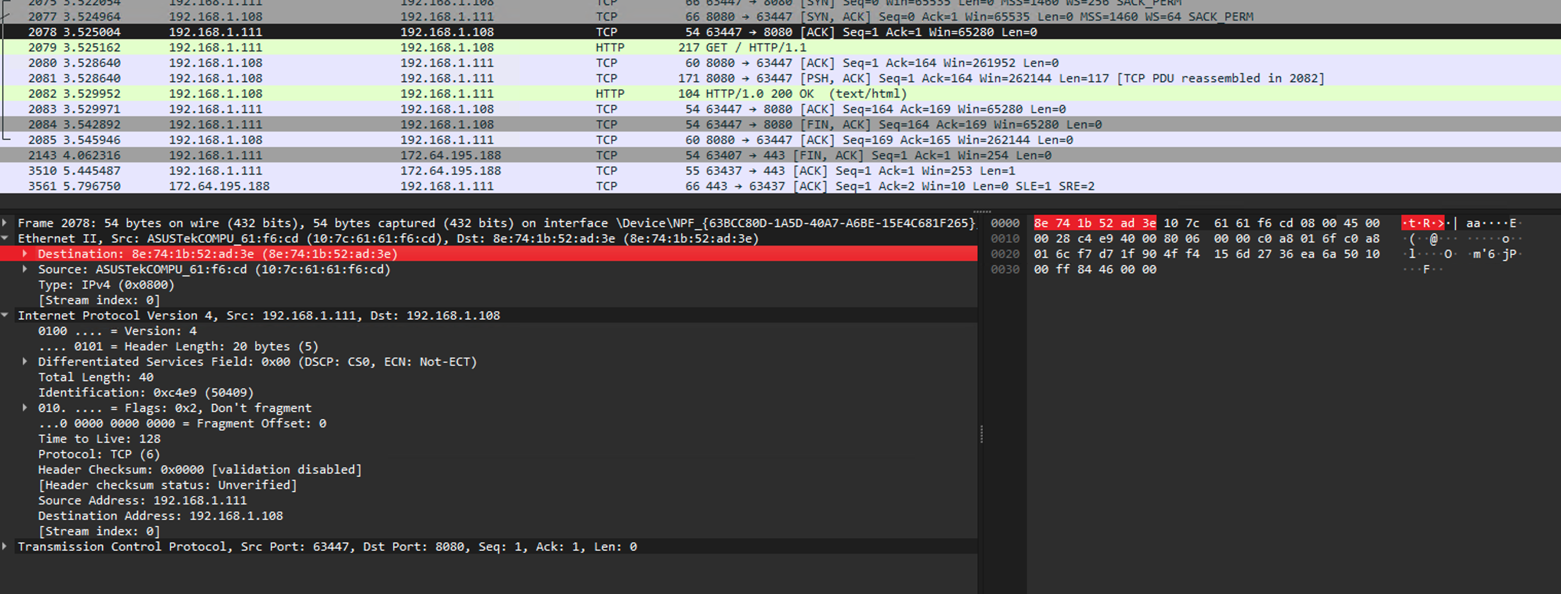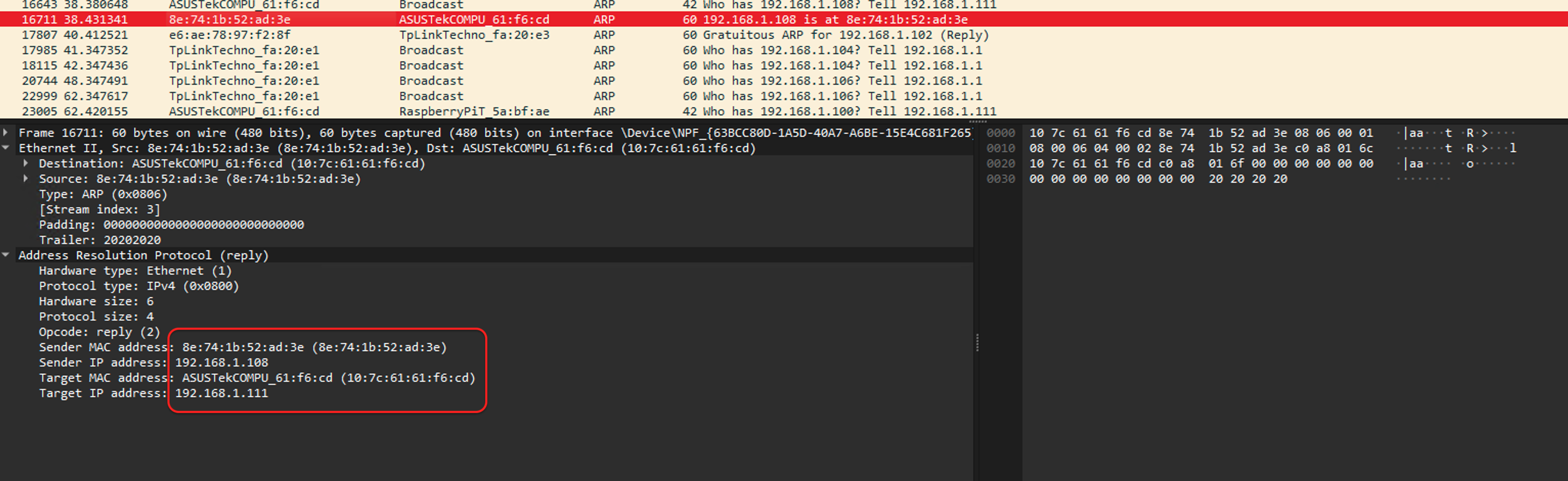 In the Ethernet section of the packet details, we can see that it contains the Mac server’s MAC and IP addresses, as well as the target’s MAC and IP addresses. This specific packet is a valid ARP packet sent by the Mac server to the Windows machine, correctly mapping the IP-MAC address pair and confirming that the MAC address 8e:74:1b:52:ad:3e is associated with the IP address 192.168.1.108.