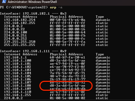 To verify whether the spoofing is effective, we need to check the ARP table on the Windows machine. Open PowerShell as an administrator and run the following command: